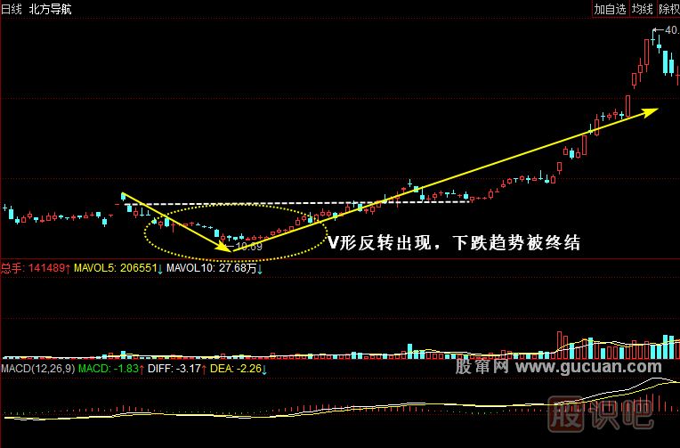我們分析,在新低之前的下跌是連續(xù)的無反抗的,而自創(chuàng)出10.69元的最低價后的上漲也是連續(xù)的無反抗的,兩段區(qū)間運行形成了一個形似“V”字的圖形。此時所形成的K線形態(tài)就是V形反轉。