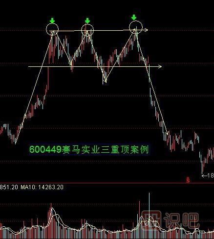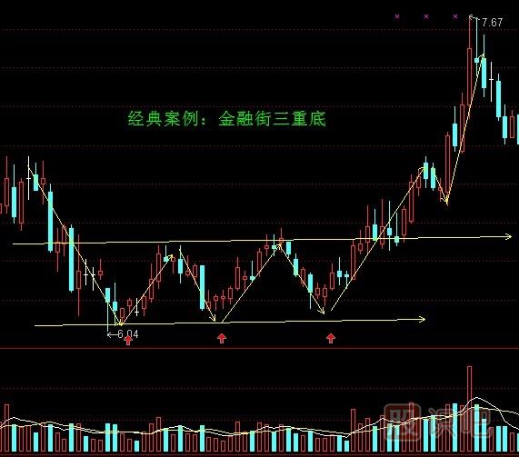 三重底。除了每個(gè)最低點(diǎn)均處于同一價(jià)位之外,與頭肩底相似。它是三重頂?shù)溺R像,只是在向上突破時(shí)成交量更加重要。