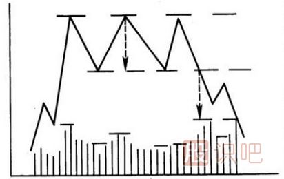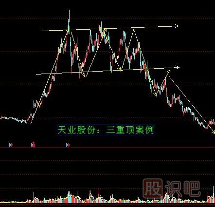三重頂。除了所有的波峰都處在同一價(jià)位之外,與頭肩形相似。每個(gè)上升行情的波峰應(yīng)伴隨較少的成交量。當(dāng)市場(chǎng)放量跌破兩個(gè)波谷時(shí)形態(tài)完成。測(cè)算技法是從突破點(diǎn)向下投射形態(tài)的高度。反抽下面一根直線的現(xiàn)象并不少見。