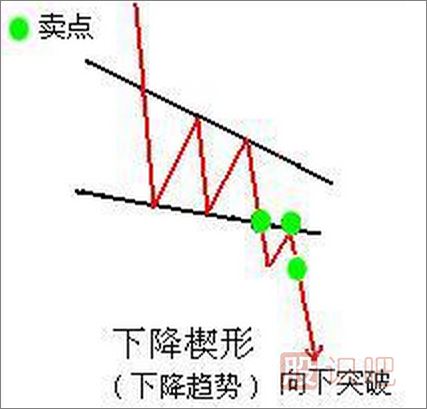 4. 上升楔形和下降楔形有一明顯不同之處,上升楔形在跌破下檔支撐后經常會出現(xiàn)急跌,反之,出現(xiàn)帶量向上突破后一般是快漲.但下降楔形向上突破阻力位后,可能會橫向盤升,成交依然清淡,隨后價格才會緩慢上升,這時的成交量亦隨之而逐級增加.