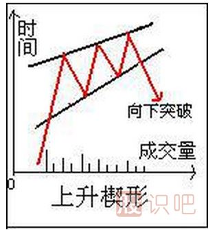 3. 上升楔形股價在形態(tài)內移動,最后終會選擇突破方向,如果向下突破,其理想的跌破點是由第一個低點開始,直到上升楔形尖端之間距離的2/3?;蛘?股價一直整理到楔形的尖端,還稍作上升,然后才大幅下跌.這時主要看量能的變化,向上升破需要有大量配合,否則就可能是騙線.