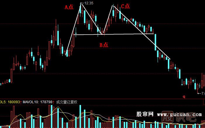 如下圖中體產(chǎn)業(yè)雙重頂形態(tài)出現(xiàn)在日線圖上,該股帶量一波上升之后在A點(diǎn)(12.35元)形成第一個(gè)波峰;在股價(jià)調(diào)整到B點(diǎn)時(shí),成交量明顯萎縮;從B點(diǎn)起,成交量略有放大,股價(jià)上升到C點(diǎn)形成第二個(gè)波峰,隨后一波下跌,直接跌破頸線。