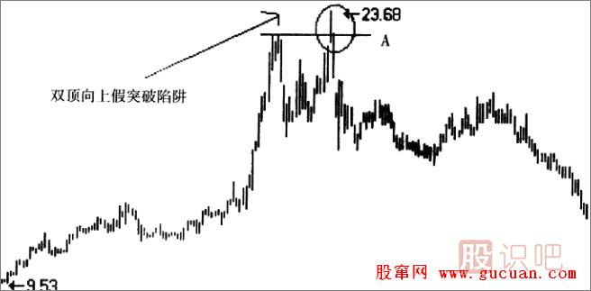 在雙頂中,我們會(huì)遇到第二波峰高于第一波峰的情形:市場(chǎng)價(jià)格在作第二次沖鋒使,竟然越過(guò)了第一個(gè)峰位的阻力,但就在市場(chǎng)正預(yù)期它會(huì)將上升趨勢(shì)進(jìn)行到底的時(shí)候,趨勢(shì)卻出現(xiàn)意料地發(fā)生了逆轉(zhuǎn),造成第二峰的高度與第一峰的高度不相等,且第二峰高過(guò)第一峰。這就是我們常說(shuō)的“多頭陷阱”。這種多頭陷阱常常出現(xiàn)在中國(guó)股市的一些著名莊股中。