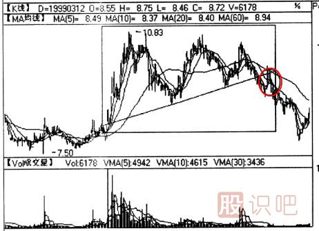 從理論上講,三重頂演變陷阱的情況有三種:一是陷于整理形態(tài)的泥塘,并形成矩形整理形態(tài)。第二種是向下假突破,形成破低反漲形態(tài)。這兩種情形都可以歸于矩形形態(tài)的分析范疇。第三種情形就是莊家利用三重頂構造空頭陷阱。