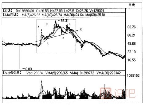 上圖頭肩頂形態(tài)出現(xiàn)在某只股票的日線圖上,該股價(jià)格在頭肩頂形態(tài)之前的一段時(shí)間里帶量上行,價(jià)格推動(dòng)出現(xiàn)第一個(gè)明顯的波峰A;隨后,在成交量的逐步萎縮之下,價(jià)格回落到B點(diǎn);在較高的成交量配合下,價(jià)格創(chuàng)出8.15元的新高,形成了頭部;從8.15元開始,股價(jià)回落到D點(diǎn)(注意此時(shí)成交量也隨之萎縮)。市場從D點(diǎn)開始上行至E點(diǎn),無力沖擊8.15元的頭部高位,形成右肩。在該頭肩頂形成過程中,成交量配合也相當(dāng)完美。最后,股價(jià)也向上回抽,考驗(yàn)頸線的有效性,但價(jià)格在G點(diǎn)處打住,并沒有回到頸線B-D之上,股價(jià)隨之輾轉(zhuǎn)而下。
