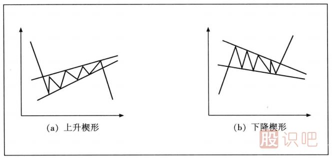 如圖所示楔形形態(tài)示意圖,其中左邊是上升楔形走勢(shì)圖,右邊是下降楔形走勢(shì)圖。在楔形的形成過程中,楔形上下兩條直線應(yīng)該明顯地收斂于一點(diǎn),否則其形成的可能性就值得懷疑。其次,楔形形成過程中,成交量逐漸遞減,上升楔形向下突破時(shí)并不要求有成交量的支持,但下降楔形向上突破時(shí)必須有大成交量的配合。