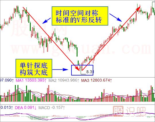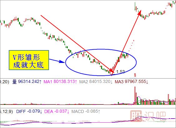 在一波下跌行情的末段,市場中的悲觀情緒明顯升溫,股價加速下行,基本呈自由落體下跌,新低連接出現(xiàn),恐慌盤不斷涌出。就在這時,該股于某日突然止跌反彈,形成了一個尖底。接下來的數(shù)個交易日里,久違了的買盤紛紛進場拉升股價,使股價迅速脫離底部,并且股價單邊上漲,拒絕回調(diào),股價上升的角度與加速下跌時正好對稱,做多的力度也與此前空方的打壓力度基本相等。從走勢上看,急跌急漲的過程在K線圖上留下了一個大大的V字形運行路線,V形底因此得名。(如圖)