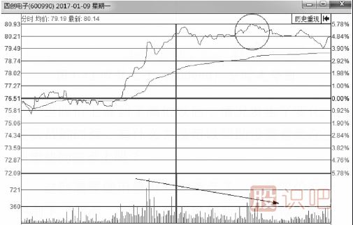 股票技術(shù)分析基本知識(shí)告知妳分時(shí)圖-量?jī)r(jià)背離賣點(diǎn)量?jī)r(jià)背離賣點(diǎn)圖3-42是四創(chuàng)電子(600990)2017年1月9日的分時(shí)走勢(shì)圖,該股結(jié)束了開盤時(shí)的調(diào)整后,在成交量放大的配合下出現(xiàn)了連續(xù)的...