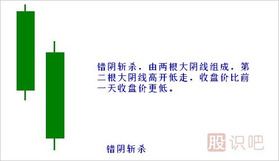 K線形態(tài) - 錯陰斬殺【K線形態(tài)組合】第二十節(jié)錯陰斬殺一、形態(tài)認識錯陰斬殺,由兩根大陰線組成。第二根大陰線為大幅高開又大幅低走,收盤價比第一...