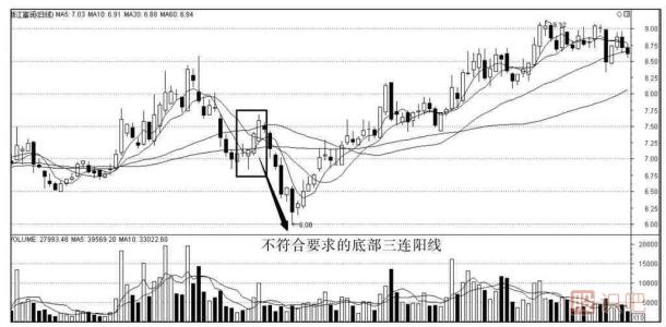不少投資者往往簡單地根據(jù)技術(shù)形態(tài)來下定義,他們認(rèn)為,底部三連陽線是指股價(jià)出現(xiàn)了連續(xù)三根陽線的技術(shù)形態(tài)。圖3-15展示的就是不符合要求的底部三連陽線形態(tài)。在實(shí)際操作中,底部三連陽線形態(tài)的形成需要以下幾個(gè)方面的特征同時(shí)出現(xiàn)。
