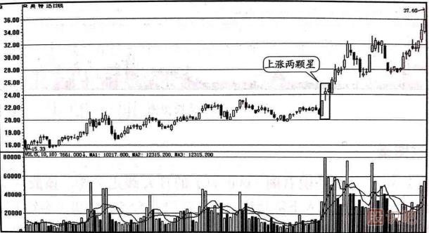 上漲兩顆星屬于常見(jiàn)的上漲中繼形態(tài),一般出現(xiàn)在大行情的初期。 大陽(yáng)線之后連續(xù)出現(xiàn)勢(shì)均力敵的信號(hào)意味著多空雙方的力量在新的條件下取得了平衡,空方?jīng)]有打壓股價(jià)的力量,多方的勝利被鞏固了,投資者對(duì)股價(jià)的上漲已經(jīng)取得了共識(shí),大陽(yáng)線取得的成果已經(jīng)得到市場(chǎng)的認(rèn)同,這往往是股價(jià)大幅度攀升的先兆。