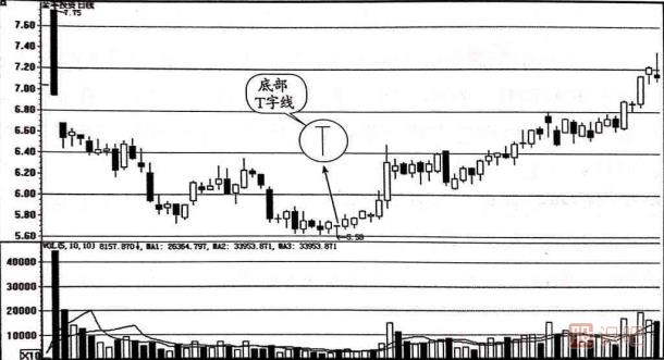 (1)底部T字線的出現(xiàn),往往是主力的誘空行為,通常伴有地量,是見(jiàn)底的一種信號(hào)。