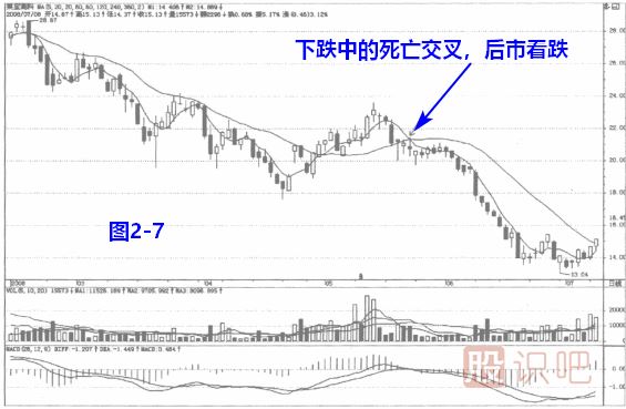 見圖2一7,股價(jià)處在長(zhǎng)期下跌中,股價(jià)略有反彈,卻再度向下,形成均線死亡交叉,投資者可擇機(jī)出局。