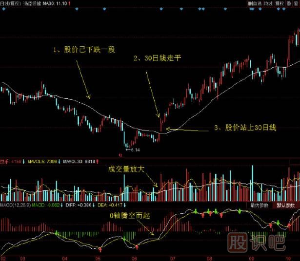 一般股價(jià)突破30日均線走平或走多,能否最終形成真正的突破,還需要看突破的時(shí)候,MACD能否在0軸附近同步金叉,或者同步騰空而起。
