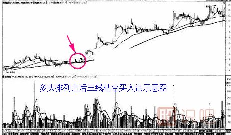 2)均線系統(tǒng)呈現(xiàn)為多頭排列之后,穩(wěn)步向上靠攏,三線逐步粘合。如下圖所示。