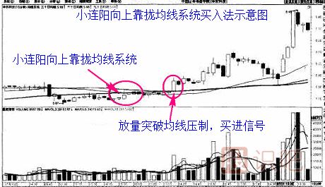 第一種 小連陽(yáng)向上靠攏均線系統(tǒng)買(mǎi)入法