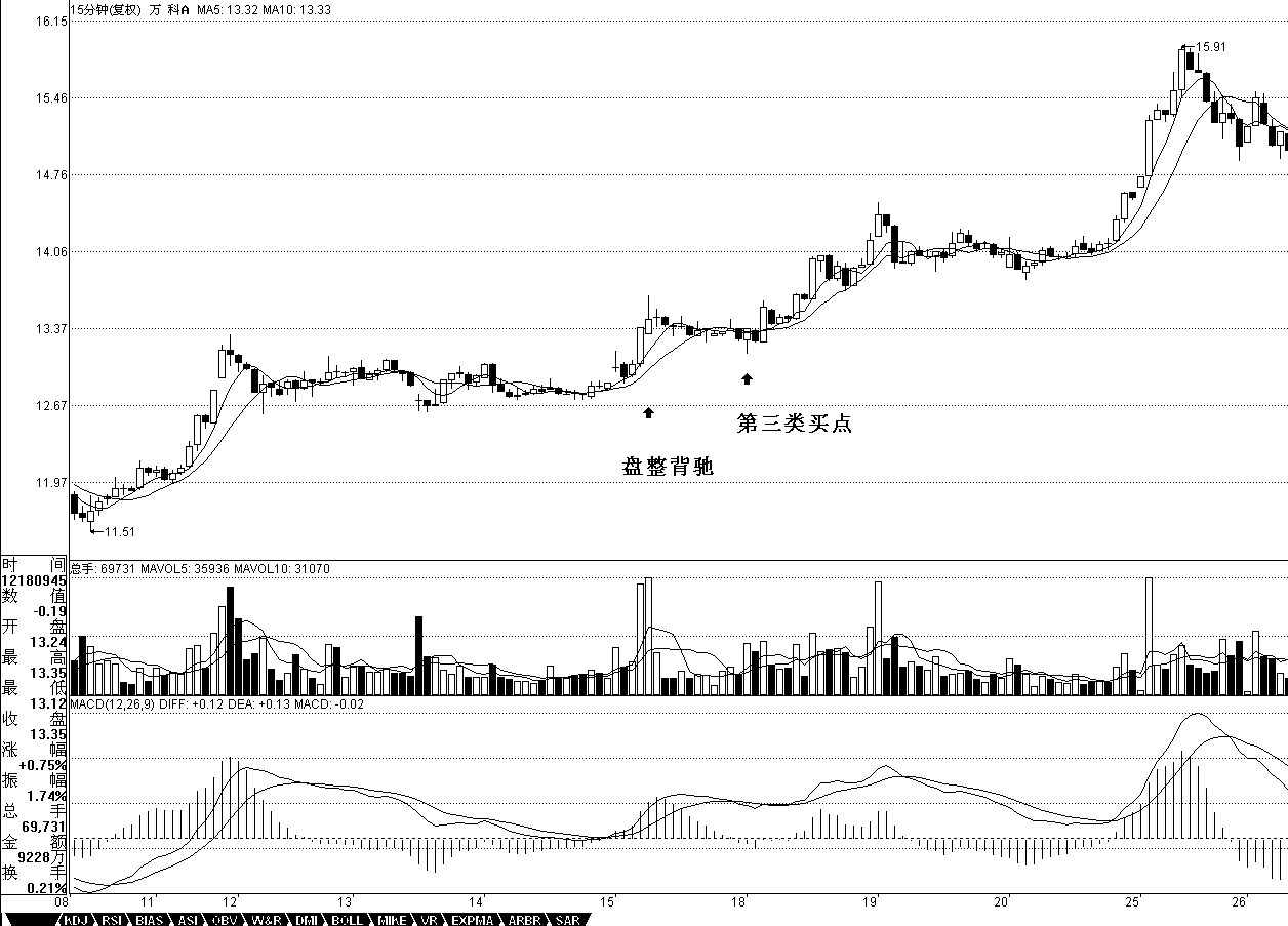 那么,有沒有盤整背馳后回跌形成第三類買點(diǎn)的例子,其實(shí)這種例子太多了,第三類買點(diǎn),有一種情況就是這樣構(gòu)成的。例如,000002萬科的15分鐘圖,12月15日10點(diǎn)45分,構(gòu)成一個(gè)盤整背馳,所以要出來,其后的次級(jí)別回跌并不重新回到前面的中樞里,就在18日9點(diǎn)45分構(gòu)成了標(biāo)準(zhǔn)的第三類買點(diǎn),這時(shí)候就該重新回補(bǔ)了。