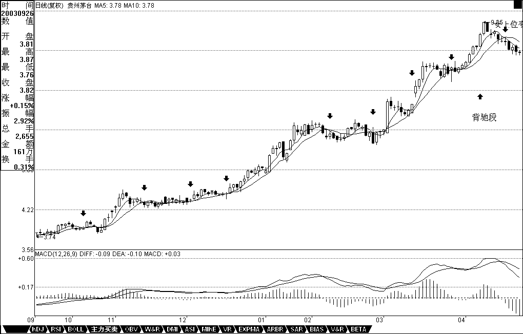 現(xiàn)在,先打開茅臺的周線圖,在茅臺快6年的周線圖上,用5周與10周均線構(gòu)成的買賣系統(tǒng),只有第一類和第二類買點各一個,可見,在周線圖上,按均線系統(tǒng)構(gòu)成的買點并不常見,一旦出現(xiàn)必須珍惜。仔細(xì)分析:2002年4月19日那周,茅臺進(jìn)入男上位,其后在2002年7月9日那周進(jìn)入男上位的第一吻,前面已經(jīng)說過,這第一吻后的下跌一般不會構(gòu)成買點,必須是至少第二吻以后。其第二吻出現(xiàn)在2003年2月14日那周,是典型的濕溫,其后在下跌并沒構(gòu)成背馳,不符合第一類買入點的原則。然后在2003年6月27日那周構(gòu)成第三吻,是一個不太強烈的濕吻,其后的下跌就出現(xiàn)了明顯的背馳走勢,在MACD圖上,綠柱子比上一次的明顯縮短,而低位卻低于上次綠柱子出現(xiàn)時的低位。如何判斷背馳走勢結(jié)束,最簡單的就是當(dāng)綠柱子縮短,而股價繼續(xù)創(chuàng)新低,這次,明顯地發(fā)生在2003年9月26日這一周,意味著底部出現(xiàn),第一類買點構(gòu)造完成,可以大舉介入了。