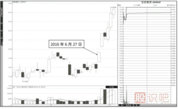 圖2-8 寶信軟件2016年6月27日的漲停分時圖