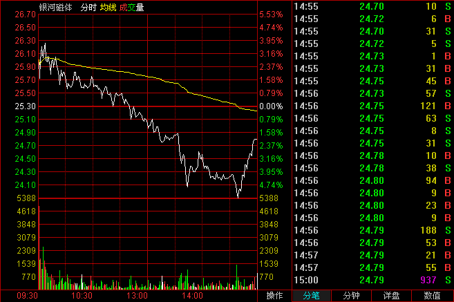 破位大陰線分時圖:開盤低開低走。然后全天保持箱型震蕩,收盤幾乎收在全天最低價。兩個細節(jié)引起注意:尾盤出現(xiàn)了一個大買單;最后一分鐘收盤價從17.9收到了17.99元。