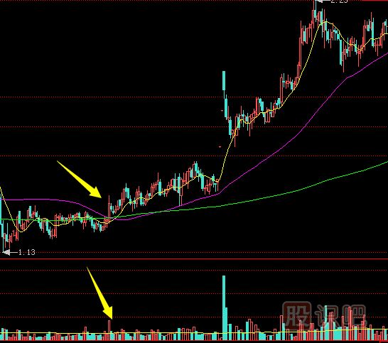 當(dāng)出現(xiàn)上漲初期的放量沖高走勢(shì)時(shí),股價(jià)應(yīng)已脫離底部區(qū)域,而且從底部區(qū)